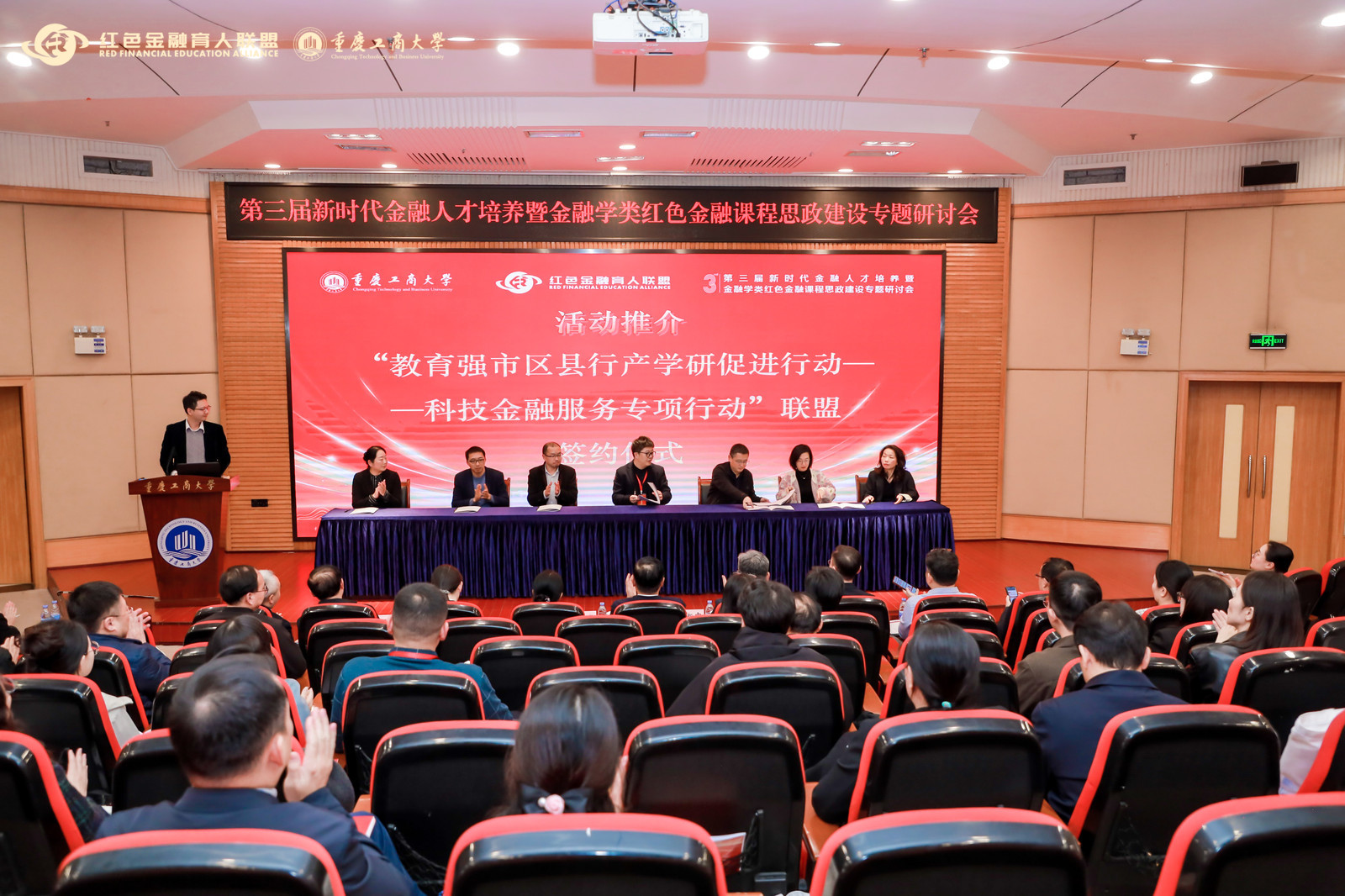 10月16日,为深入贯彻国家创新驱动发展战略,推动创新链、产业链、资金链、人才链深度融合,积极响应重庆市“教育强市区县行”产学研促进行动部署,由重庆工商大学牵头,联合西南大学、西南政法大学、重庆师范大学、重庆理工大学、重庆财经学院、重庆建筑工程专业学院等7所在渝高校,并汇聚金融机构等多领域专家,共同发起成立“‘科技金融服务专项行动’在渝协作联盟”在重庆工商大学、北京联合大学主办的“第三届新时代金融人才培养暨金融学类红色金融课程思政建设专题研讨会”上进行推介签约,并正式发布行动宣言,开启在渝高校科技金融协同创新新篇章。